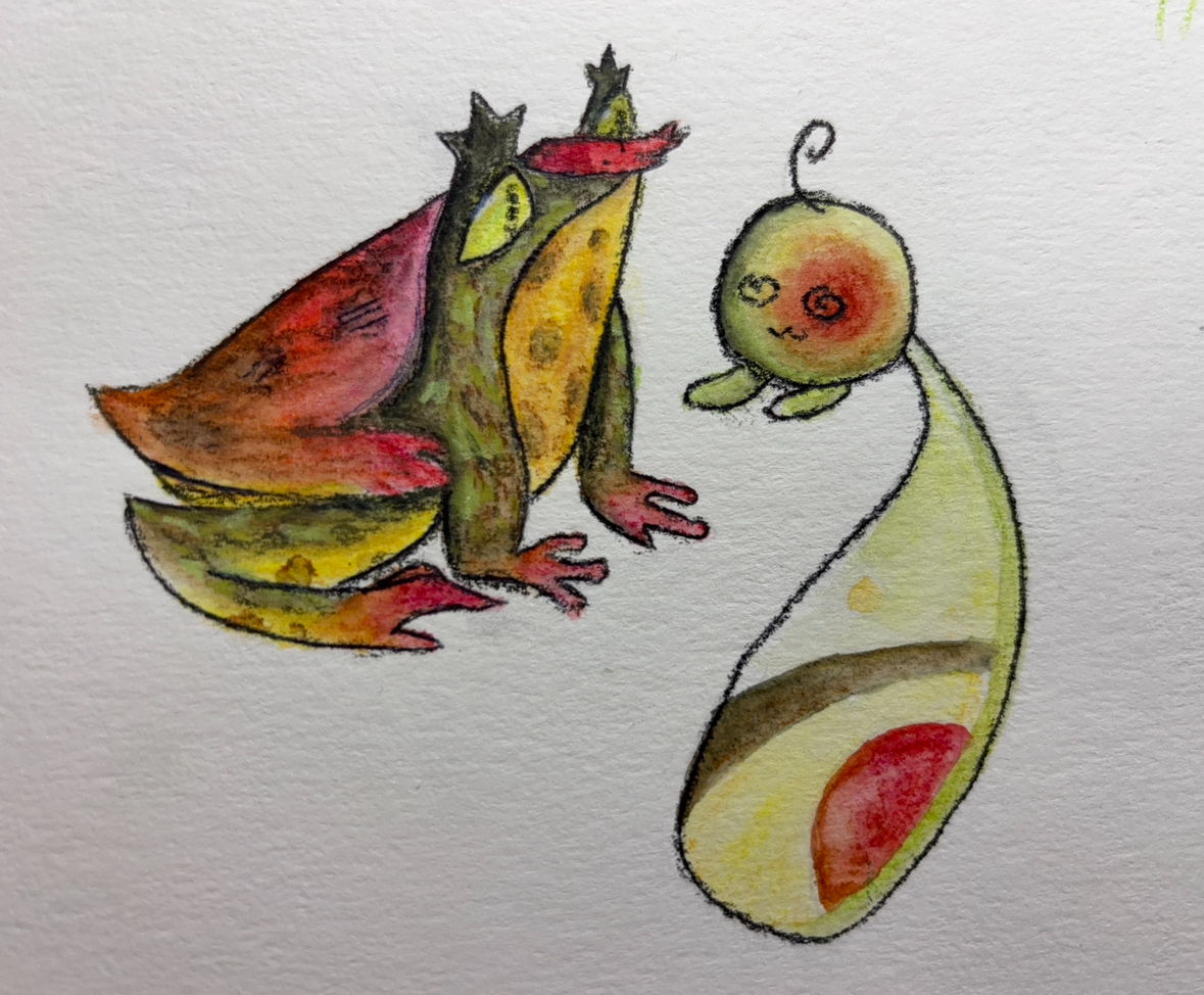 "Whirliwog" comes from "whirligig" and "pollywog," while "acerog" comes from "Acer" (the genus of maple trees) and... "[f]rog". Also, it seems like maple trees go by two names in Japan; momiji, which also just refers to red foliage in general, and kaede, which seems to refer to maple trees in other times of the year (and apparently comes from 蛙 (kaeru, “frog”) + 手 (te, “hand”) due to the shape of the leaves). At one point while planning this, I was trying to go in a Hoppip-mammalian sort of direction and have it evolve into a bunny somehow, but I think all the stars were aligned for frog, y'know?